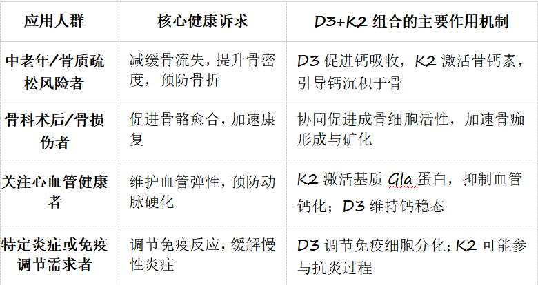 基于上述科学证据,D3+K2的组合已不再是一个模糊的健康概念,而是能针对不同人群的特定需求,提供精准的营养支持方案。